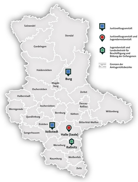 Der Bund der Strafvollzugsbediensteten in Sachsen-Anhalt verfügt über Ortsverbände in allen vier Vollzugsanstalten in Sachsen-Anhalt. Dabei ist die Binnenstruktur in den Anstalten teils verschieden. Die Justizvollzugsanstalten in Burg, Halle und Volkstedt sind zuständig für männliche Erwachsene, Halle ist ebenfalls zuständig für weibliche Erwachsene und die Jugendanstalt in Raßnitz ist zuständig männliche Jugendliche und Heranwachsende.